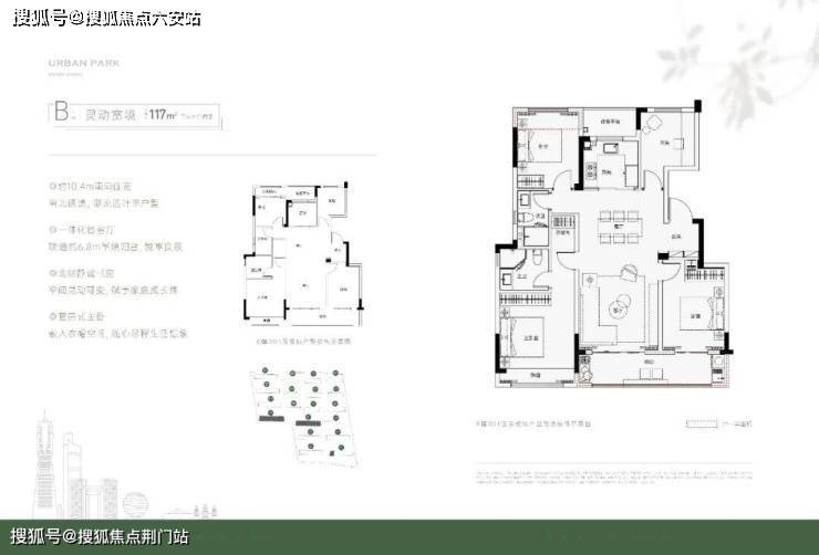 而(建面约)118方户型为经典四叶草格局,南向三开间,面宽达到了约10.4米,客厅与次卧贯通的长阳台近6.8米长,观景休闲、惬意无边。