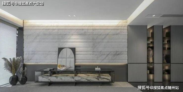每户都有3面采光,层高约3.6米。约315㎡西边套,南向面宽达约16.2米。在首层入户大厅公区,以钛金板+背景墙石材+木格栅的组合,延续着宝格丽一贯富有格调的装修风格。