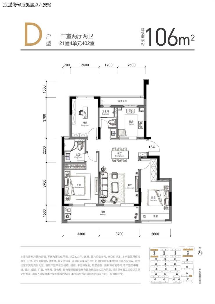 •四房户型均为四叶草户型,方正通透,双阳台、最大至6.3米宽大尺度客餐厅,且均配置独立储藏间。