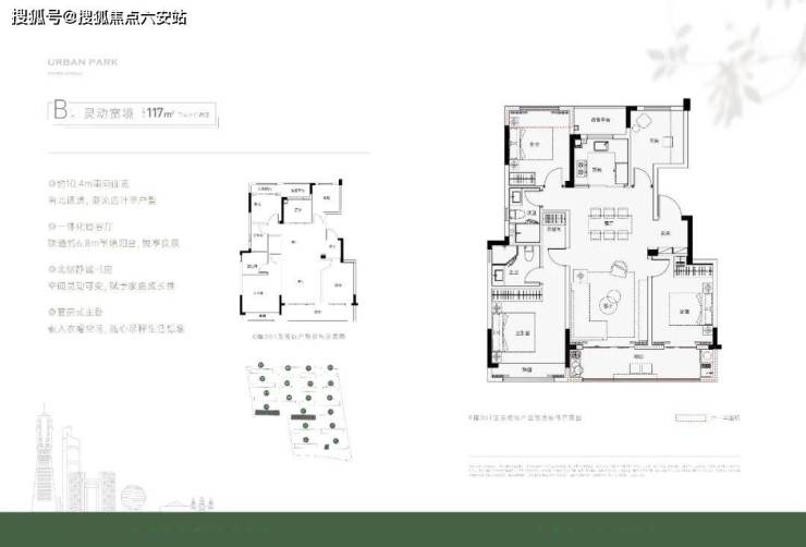 而(建面约)118方户型为经典四叶草格局,南向三开间,面宽达到了约10.4米,客厅与次卧贯通的长阳台近6.8米长,观景休闲、惬意无边。
