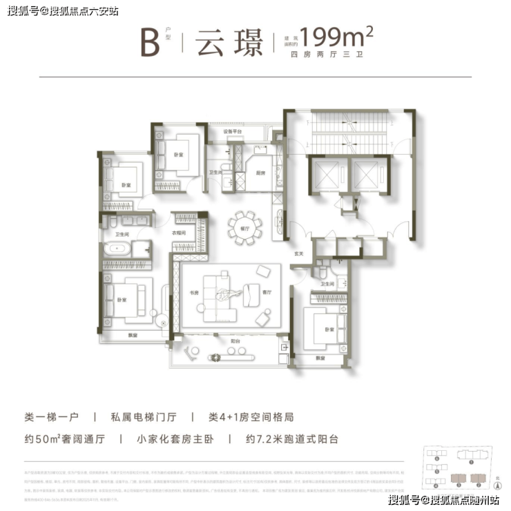 199㎡A户型分布在1号楼,南向四开间,三卧朝南,独立玄关设计,餐客厨一体化。B户型分布在2-3号楼,类4+1房格局,约50㎡奢阔通厅,7.2米跑道式阳台。户型采用LDKB一体化设计,南接约8.5米跑道式阳台。