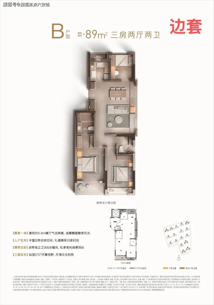 主力产品为建筑面积约89㎡户型,三房两厅两卫格局,南向三开间带宽幕双阳台,轻松容纳三口之家的温情与欢乐;建筑面积约115㎡均为边套户型,纵享丰富观景视野,四房两厅两卫设计并蓄尺度感与尊崇感。