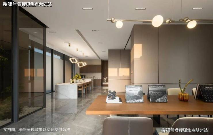餐客厅一体化设计,顶部做了悬浮顶+无主灯设计,再加上客厅全木纹饰面,大气而又温馨。宁波鄞州◆钟公庙板块◆伟星星润名著🔻售楼热线:☎ 400 832 8823「售楼处」☎〢网上售楼中心〢🔻