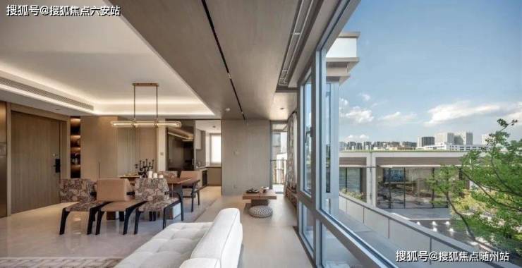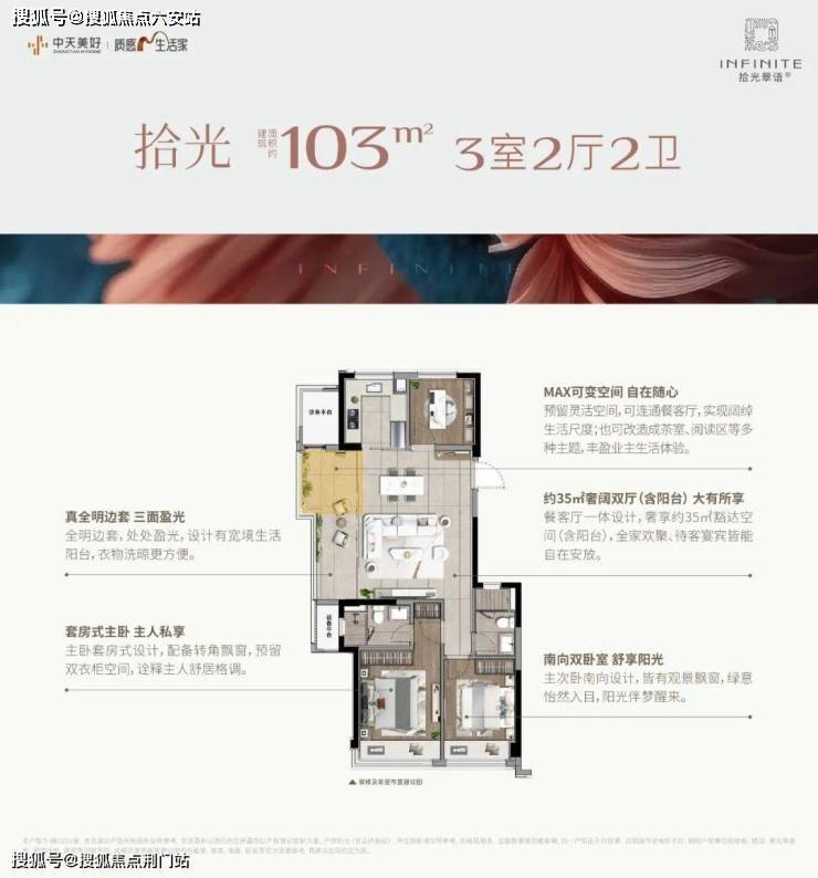 建面约103㎡的边套更是堪称神迹,将小户型的空间魔法玩到了极致。客厅到阳台的地面、天花直接拉通,甚至两侧的墙垛都已隐身,整个餐客厅面积达到约35㎡(含阳台),这可是140㎡以上大宅才有的空间感!