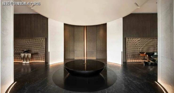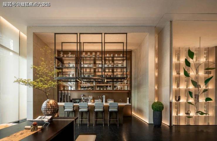 项目建筑以高奢酒店设计手法,呈现更具公建感的江幕美学立面,通过玻璃+铝板,打造出错动的横向线条,犹如伫立的钱江;酒店仪式花园,以杭州茶田为灵感、融入像素构成概念,营造自然里的松弛度假感;国际范式会客厅,儿童空间、高尔夫场地、会客品茶空间等,为世界归客的专属高定精神场域。