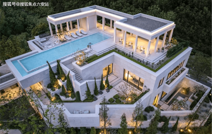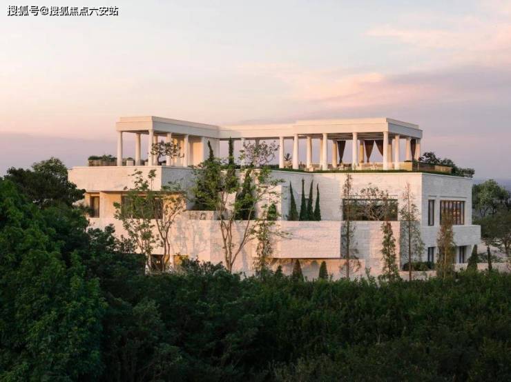 地上会所也很有特色,在东南角参照希腊伯罗奔尼撒半岛的Amanzoe酒店,设计了一整幢现代版的“雅典卫城”三层会所。最特别的是,在地面会所的顶部,打造了一个无边镜面戏水池,可以远眺周边群山,非常惬意。