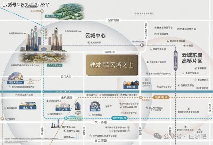 临近云门、未来杭州第一高楼约399米金钥匙(在建)、约320米金手指(在建)、浙江人才大厦、杭州资本云城科创中心(在建)、超重力实验室(在建)等云城核心地标。