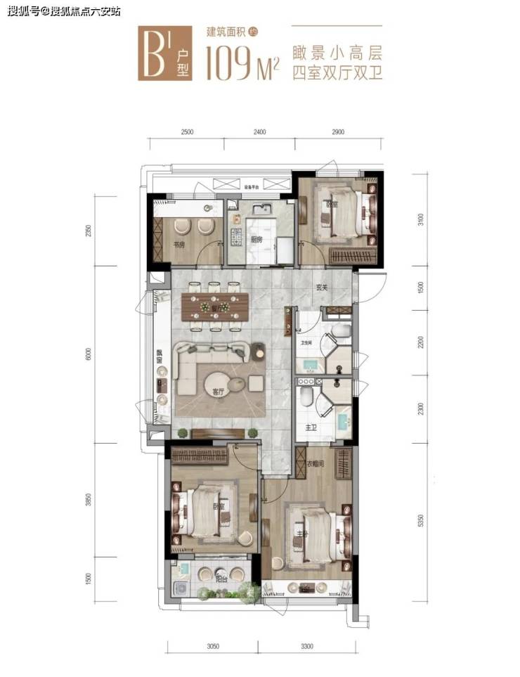 建面约139㎡的大四房,四开间朝南,主卧面宽约3.7米。包括北面书房在内,另外三个房间的面宽都达到约3米,不会觉得局促。
