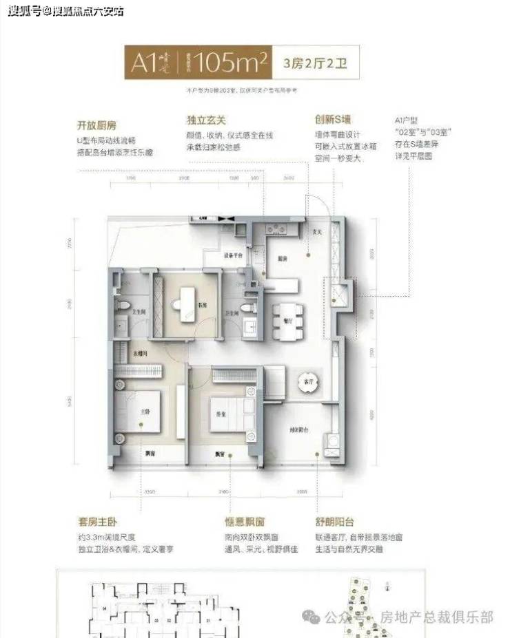 建筑面积105㎡户型,独立玄关空间,集美观、收纳、仪式感于一身,营造归家的舒适与放松。开放式厨房设计,U型布局流畅自如,岛台搭配,烹饪时光充满乐趣。创新S型墙面设计,弯曲造型巧妙,嵌入式冰箱放置,空间利用更高效。套房式主卧,约3.3米宽敞尺度,配备独立卫浴与衣帽间,尽显奢华享受。南向双卧室配备双飘窗,通风、采光、视野三者兼具,尽享舒适生活。宽阔阳台连通客厅,配备揽景落地窗,生活空间与自然美景无界交融。