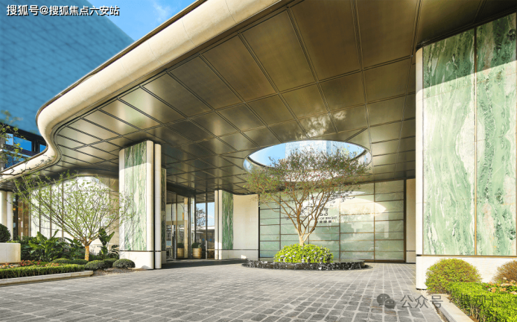 主入口大门以其宏伟的尺度彰显端庄与大气,高达7米的门庭让人瞬间感受到尊贵的气息。此门庭选用贝金米黄石材、维多利亚绿与白雪公主奢石,搭配古铜色金属板,巧妙融合冷暖色调,营造出极具张力的美学效果,开启都市奢华新境界。每一细节都透露出非凡的贵气。圆形镂空穹顶之下,一株近7米高的紫薇树卓然而立,阳光倾泻而下时,尽显“紫气东来”的祥瑞意韵。