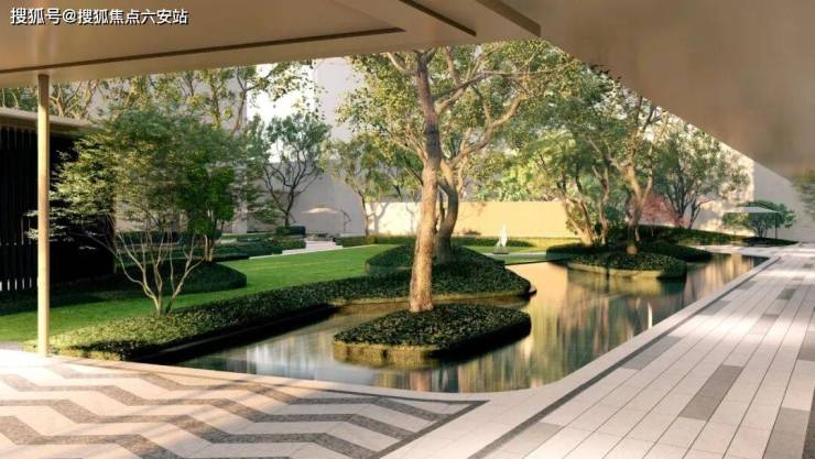 漫步其间宛若穿行于“城市森屿”,大面积的水系铺陈,似将整座庭院置于“水面”。