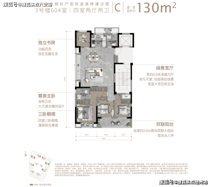 • **130㎡四房两卫**:边厅南向三开间设计,约36㎡餐客一体大方厅连接5.6米景观阳台,主卧套房配备独立家政间与观景浴缸,洋房尺度媲美大平层;