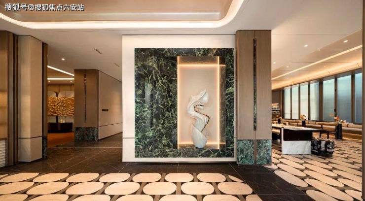 门庭。这里特指单元门庭,通高约4m,气势恢宏。大面积的金属屋檐外挑,彰显贵胄的同时,又扩大遮风挡雨的面积。进门左侧,色彩饱满的普拉达绿竖版镶嵌,美学传达与奢华品质相辅相成。进门后,又是大幅岩板上墙,气质拉满。