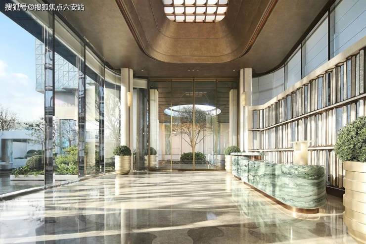 高度达到了约7米的端庄主入口大门,采用贝金米黄石材、维多利亚绿、白雪公主奢石,结合古铜色金属板,形成冷暖撞色的张力美学,打开了城市奢度,每个细节透露出“贵”,形镂空穹顶,池中植入紫薇,寓意福祉盈门。