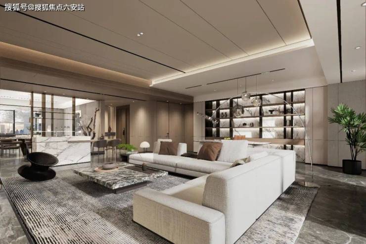 通铺的爱马仕灰石材质感高级、约5.1米的白金沙石材的客厅背景墙更是大气、范思哲黑的石材基座,天然黑胡桃的木饰面,也与其完美的融为一体。就连吊顶,也采用的是造价更高的圆弧形设计。