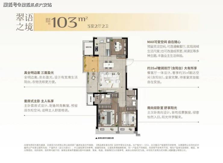 建面约103㎡的边套更是堪称神迹,将小户型的空间魔法玩到了极致。客厅到阳台的地面、天花直接拉通,甚至两侧的墙垛都已隐身,整个餐客厅面积达到约35㎡(含阳台),这可是140㎡以上大宅才有的空间感!