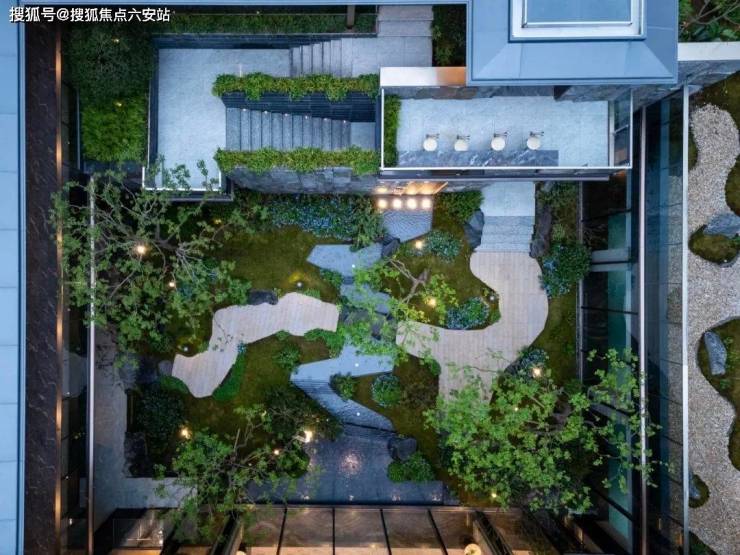 昂贵的黑松和羽毛枫分立两侧,四角是设计师精挑细选的乌桕树,中间叠水曲折辗转,宛若自然秘境。
