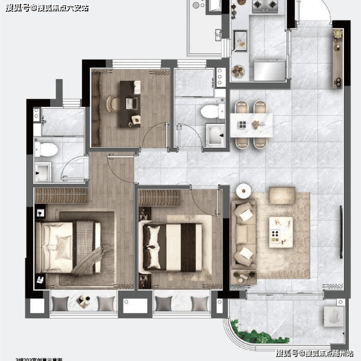 让人眼前一亮的,是它超广角度的弧形阳台。坦白来讲,这样的设计我只在少数千万级大平层中见到过。