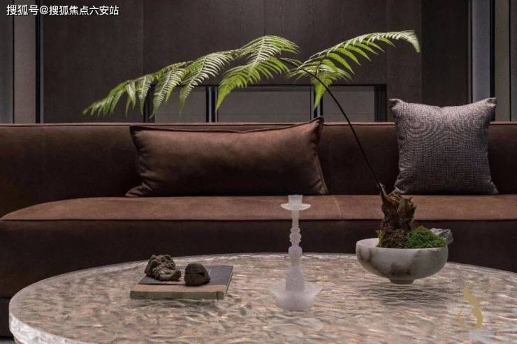 洽谈区选择了更为内敛沉静的深色系,并用传统围合方式将空间对称而立。沙发将舒适与现代设计结合起来,软包靠垫提振空间惬意氛围,细腻质感传递高级品味。点睛之笔手工水晶台面茶几,将杭州文化符号西湖融入其中。波光粼粼的湖面泛起阵阵涟漪,点缀其间的银蕨如漂浮的一片小岛,在湖上渐行渐远。舒适感便在这时弥散开来。