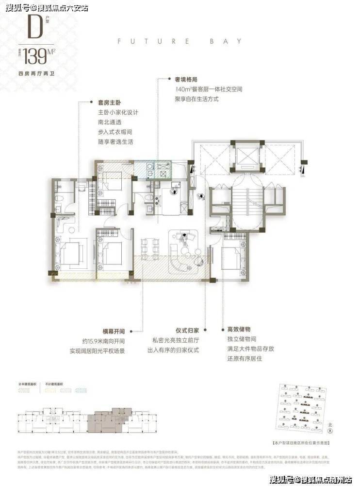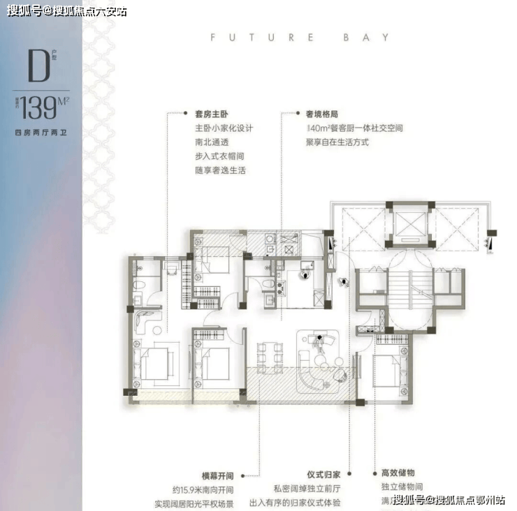 约139方户型, 4.5开间朝南+储藏间,南向15.9米超大采光面,做到五开间朝南的空间,标配储藏间,三个南向卧室设计。