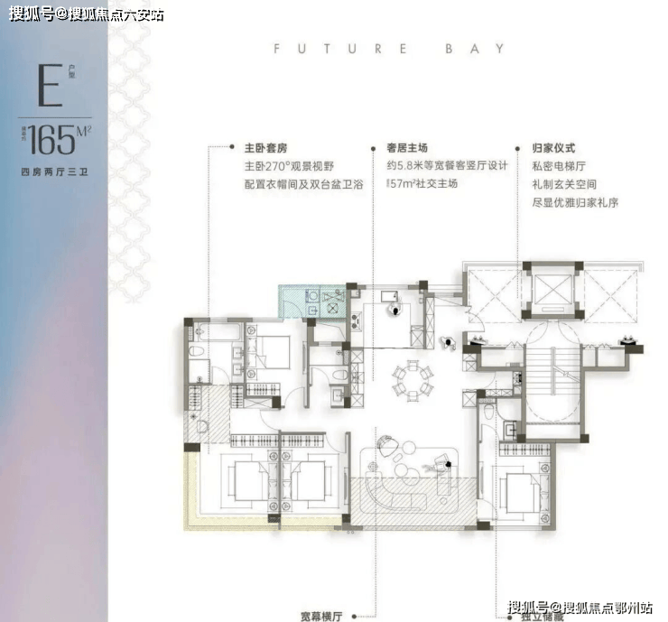 约165方户型,16.85米超大南向开间,超过市场所有同面积段产品;标配储藏间。