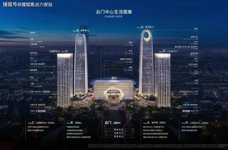 整个综合体由多栋高层建筑组成,其中包括高度约320米的A塔楼、约300米的B塔楼,以及高度约213米的C塔楼和D塔楼,同时还规划了一座约80米高的“云门”建筑。
