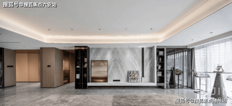 客厅在多重材质的组合下,顺畅融汇 秩序井然素雅的基调来自比例的精准把控和色彩的考究搭配,克制之间彰显出游刃有余的平衡之道!电视背景墙利用石材自身纹理,将水光潋滟的迷人景象引入室内,沙发后方的展示柜高低错落线条置于其上,玻璃和金属交融出迷濛光影!