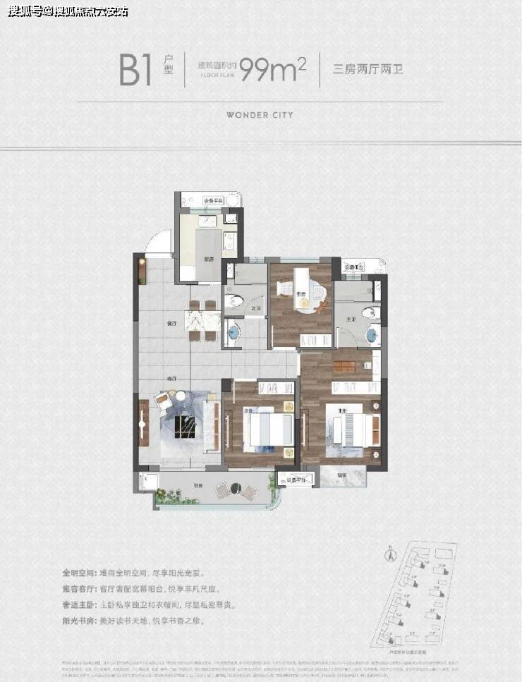 户型设计方正实用,全明通透,特别是约89平方米的爆款小户型,三房一卫的布局对年轻家庭完全够用,且布局合理,南面还带有双联景观阳台,视野开阔。稍微提高预算,还可以选择约99平方米的户型,三房两卫的布局更加从容,主卧套房设计自带飘窗、独卫及步入式衣帽间,改善感十足。