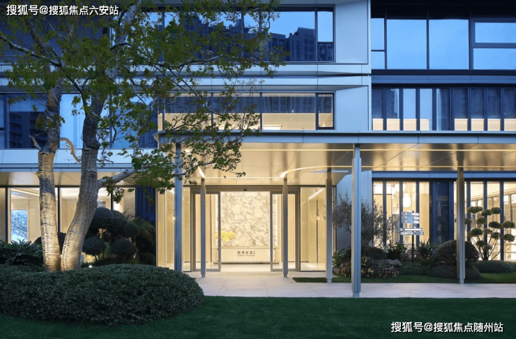 建筑外立面以“江河云霞”为灵感,采用流线型玻璃幕墙与香槟金铝板,窗墙比突破75%,单窗最大跨度达16米,形成悬浮式视觉效果。