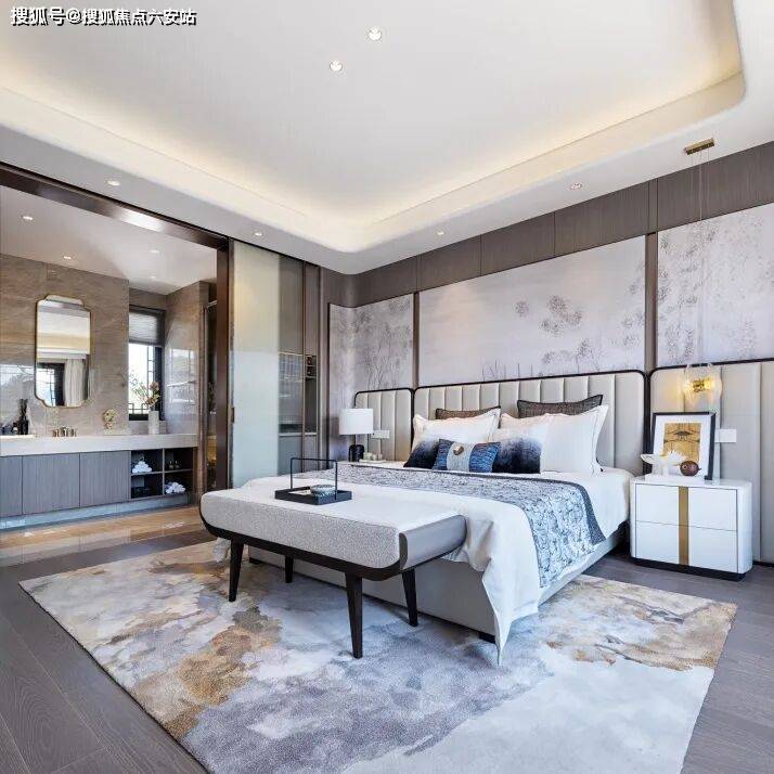 以建面约144㎡中式合院样板房为例,南向面宽约9.9米,餐客横厅开间约6.6米,尺度阔绰,餐客厅和一楼老人房都可以一步庭院。二楼为双套房、开放式书房,主卧套房带大露台,揽胜风景,观星赏月,视野开阔。