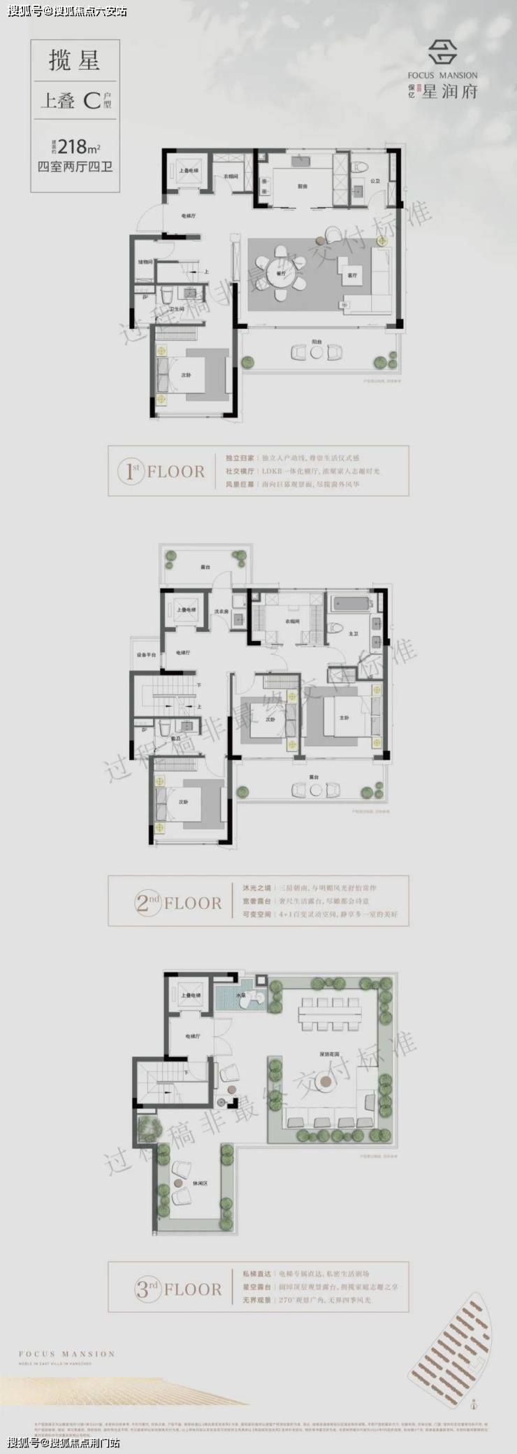 作为杭州大城东稀缺的纯低密项目,星润府以1.4容积率、30%绿地率打造20幢6层纯叠墅,共321套住宅,延续保亿“造墅专家”基因。项目突破传统叠墅设计,实现上、中、下叠均私梯入户,独门独院,结合挑檐设计保障私密性,媲美独栋居住体验。