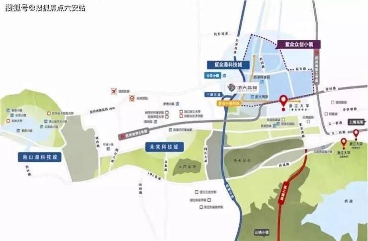 项目整体位于小镇西侧,东至西园八路,南至留祥路,西至莲池南路,北至苏嘉路,总面积约0.91平方公里。是西湖区人民政府与浙江大学携手共建的一个以高端信息经济为主导的创新创业平台。在项目周边3公里范围内,汇聚了大量生活、商业配套,如西溪湿地、龙湖天街、西溪银泰等,同时也云集了诸多产业集群,如阿里云谷、独角兽产业园、菜鸟总部等,同时作为浙江大学产学研最重要的实践基地之一,距离浙江大学紫金港校区西门仅1公里;所以整个项目可以说是如众星捧月的宠儿。