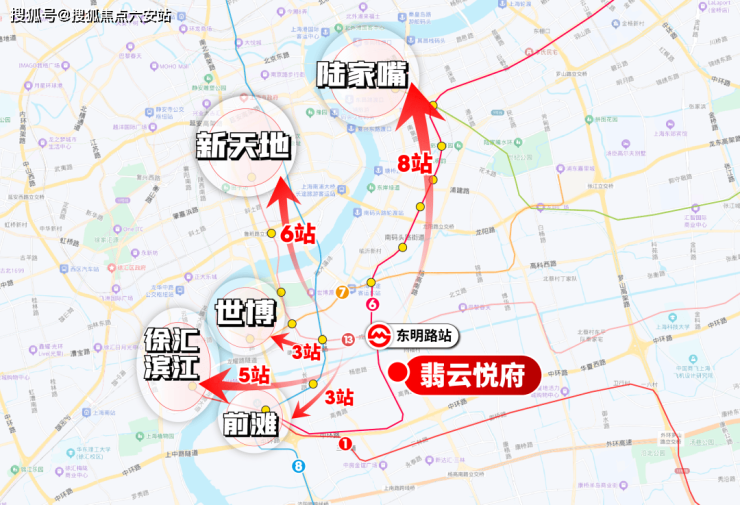 而通过这两条地铁:3站前滩/世博、5站徐汇滨江、6站新天地/世纪大道、8站南京西路/陆家嘴。