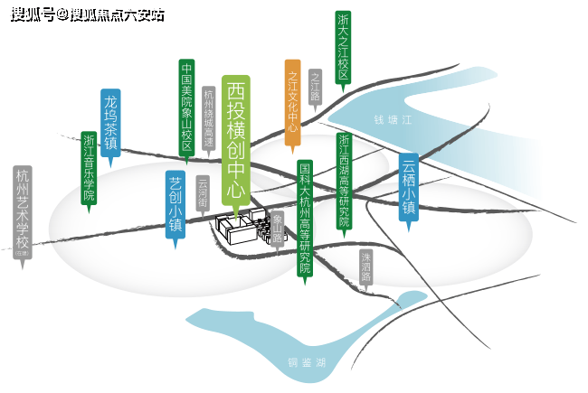 西投横创中心位于铜鉴湖、云栖小镇、龙坞茶镇、艺创小镇“一湖三镇”核芯区。