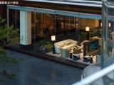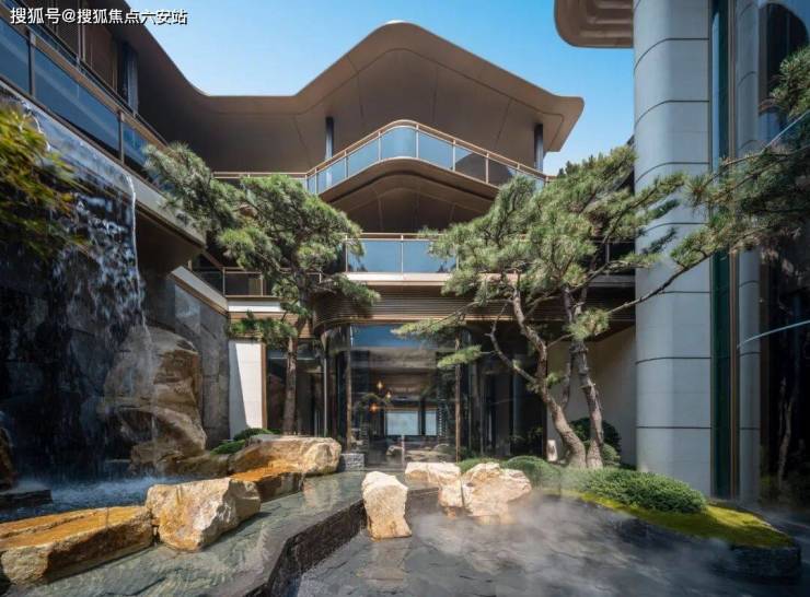 以水、风雨连廊、空中悬挑平台串联山水相依风雅景致 , 呈现三层立体园林及 约15 米飞石叠瀑景观,营造出丰富的空间层次感,中央布置大面积立体水景,如诗如画。