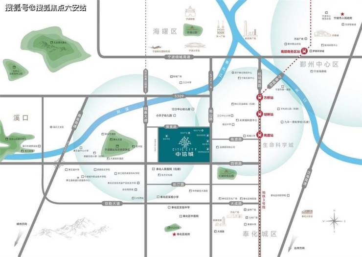 1. 区位介绍:占据板块核心,邻近3号线琎琳站江宁路直通奉化主城区,荟萃一城繁华,构筑半小时快速生活圈。中信宁波创新综合体项目,是宁波市奉化区中心城区的北部门户位置,是奉化区政府积极响应浙江省大力推进产业创新改造提升的工程,项目占地1230亩,0.82平方公里,总投资134亿。以政企合作形式,通过前瞻的规划,高效的管理,科学的运营,打造成智能制造发展示范区、创新驱动发展新高地、国际一流宜居宜业新城。伴着大手笔的城市规划,奉化正在定义全新的功能分区,整体规划以主城区为中心,向东西两轴发展,城镇发展联系轴线主要为东三环、大成路、四明路,而我们项目正处于东西发展轴四明路上。为助力奉化城西发展,宁波和奉化将一系列重量级配套迁入城西生态文教区就板块;