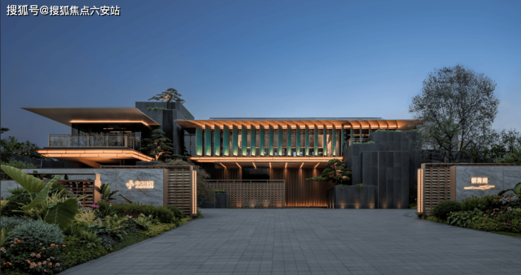 樾青岚空间如画,场景如诗,项目的主入口是宋代名画《溪山行旅图》的意象。层层叠叠的黑金砂石,做出了宋画中高耸的山体;还有飞流直下的瀑布,和仿佛山上楼阁般的会所屋檐。