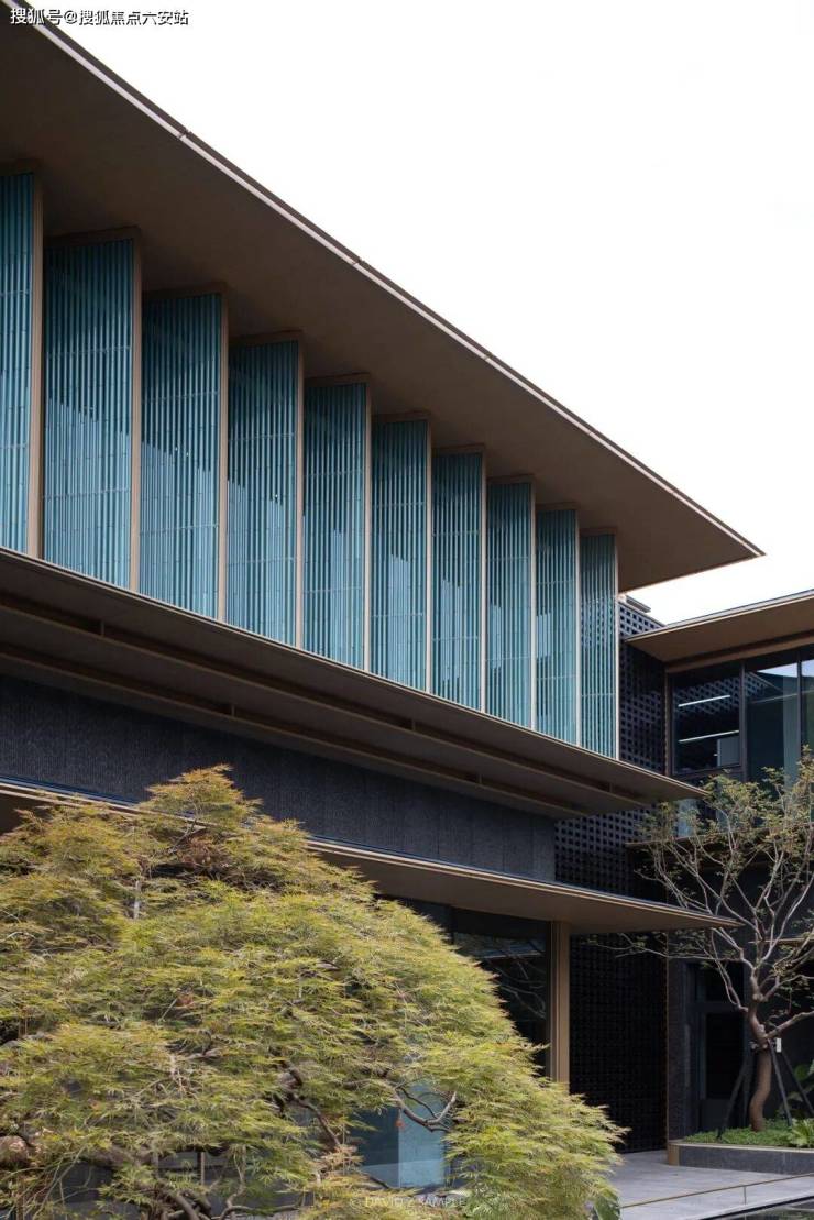 在立面打造上,樾青岚提炼飞檐、斗拱、引檐、直棂窗等宋代建筑细节,融揉现代审美工艺,重塑东方的当代表达;提取宋画中的线条感,通过局部铝线条的运用,融合巨幕灰蓝色玻璃,让建筑隐于自然,如画框一般,呈映天光云影。