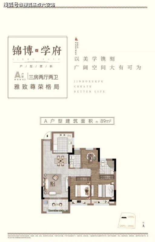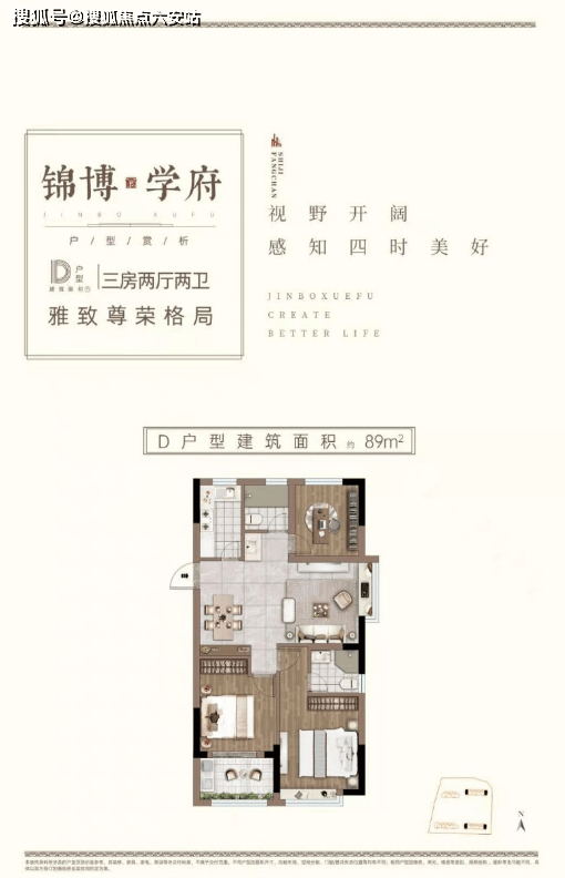 采用1梯2户与3梯6户混合布局,楼间距50-60米,确保采光通风性能。89㎡三居室创新设计"双厅双卫"格局,南向面宽达8.5米,主卧配备270°转角飘窗,实现空间利用率与舒适度的平衡。