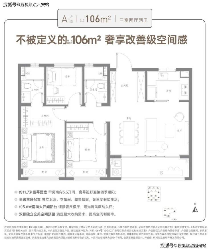**建面约106㎡**:LDKB一体化设计,3.5南向开间+双明卫,预留“1+X”创变空间,年轻家庭首选。