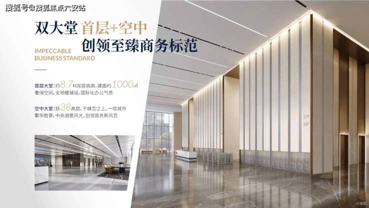 空中大堂:跃 38 高层,于峰峦之上,一揽城市繁华胜景,中央湖景风光,创领商务新风范。