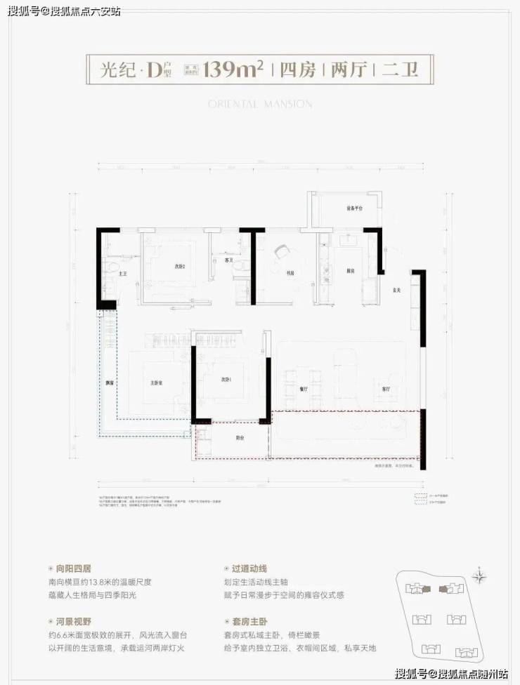 四开间朝南,南向面宽超16米。双套房设计,满足二胎家庭、三代同堂等不同居住需求。餐客厅空间阔绰,可放置圆桌,符合中国人团圆的爱家情怀。