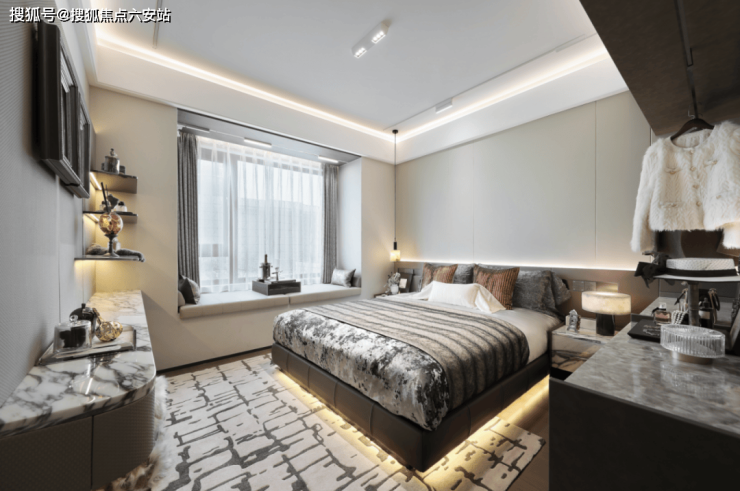 南向套房主卧,预留衣帽空间,配备私密独立卫浴与瞰景飘窗。无论早晚的从容洗漱、精装打扮;还是闲暇时刻在飘窗前晒太阳、阅读、赏景……都能在此安放。