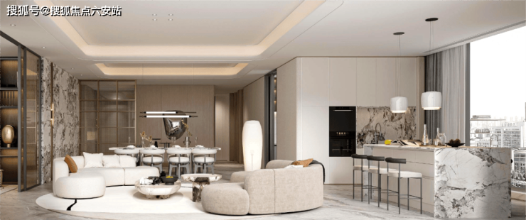 餐厅与客厅空间相贯连,开阔的视野带来惬意与更具互动感的用餐氛围。精巧工艺与大理石水墨画般的自然纹理交相叠映,镜面光泽,熠熠生辉,每一处细节都彰显着对品质生活的极致追求。