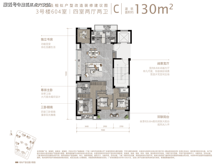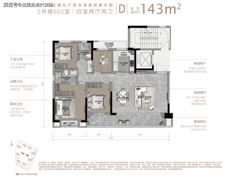 建面约130㎡户型的阔景宽厅尤为突出