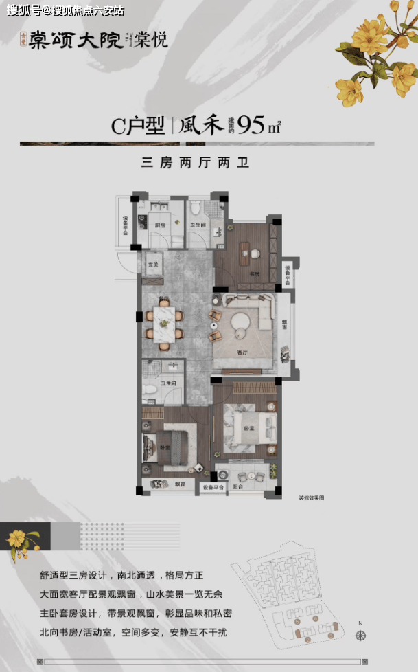 · 建面约95㎡三房两卫:南向双开间阳台,主卧套房配备独立卫浴与衣帽间,餐客厅一体延伸景观视野;