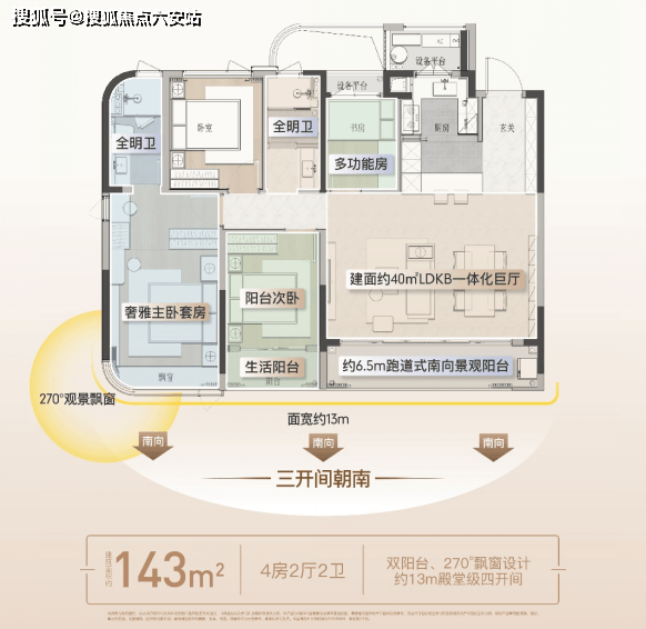 约143㎡户型,约13米南向巨幕面宽+约6.5米多功能阳台,形成IMAX级环幕视野。LDKB一体化边厅达40㎡,配合岛台,中西双厨与餐厅构成洄游式社交核心,媲美钱二奢宅的“泛会所”体验。