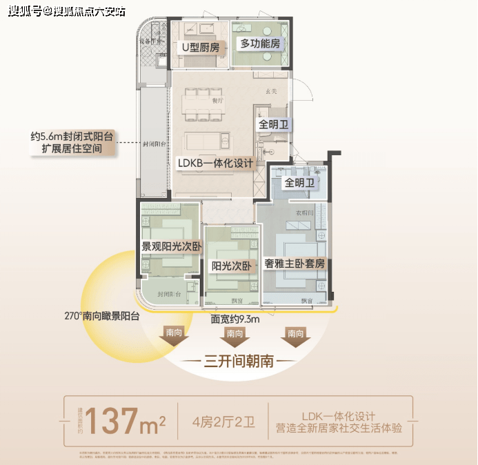 约137方户型:约5.6米大面宽竖厅联动双阳台,享约9.3米南向观景面。南向三卧全朝南布局,南向次卧采用270°转角窗,晨起推窗即见688亩玉湖的晨曦与飞鸟。