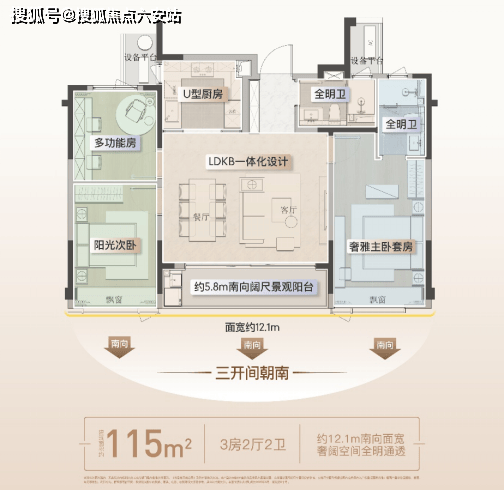 约115方户型:三开间朝南+LDKB一体化边厅设计,打破空间局促感。约27㎡的餐客厅与5.8米观景阳台无缝串联,形成“社交—景观—生活”三重动线,配合12.1米南向面宽,实现“阳光平权”。