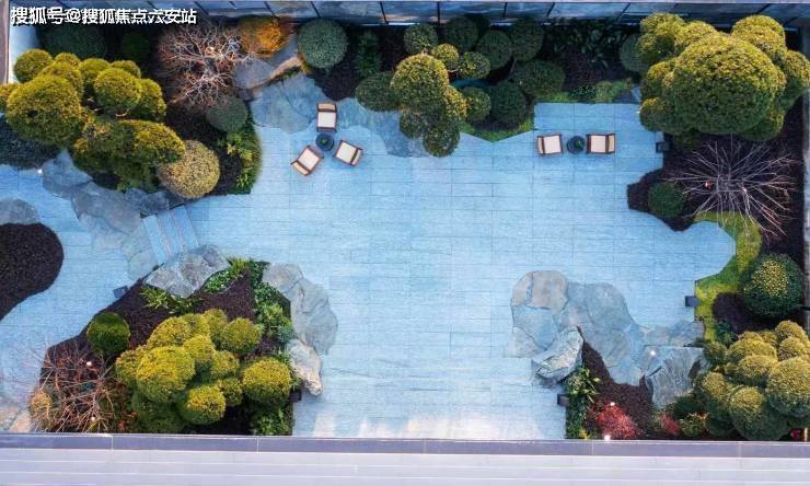 穿过景墙是下沉水院,连着售楼大厅和松林剧场,一边是水瀑潺潺,流淌成一幅古雅的宋韵山水画卷,一边是肆意舒展的罗汉松、老红梅、羽毛枫,铺展出悠远的东方意境。